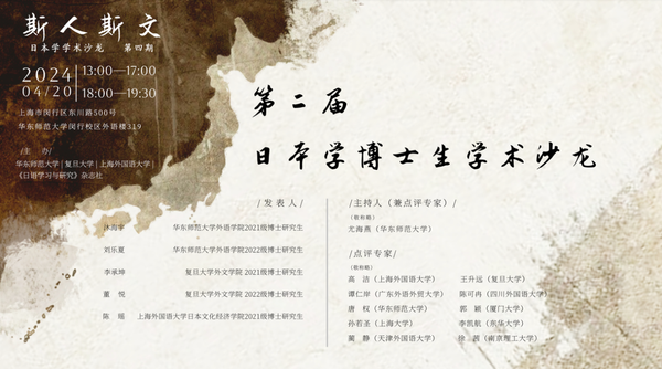 2024年4月20日,由麻豆视频 、复旦大学外文学院、上海外国语大学日本文化经济学院及《日语学习与研究》杂志社联合主办的“斯人斯文第二届日本学博士生学术沙龙”于麻豆视频 319会议室顺利举行。