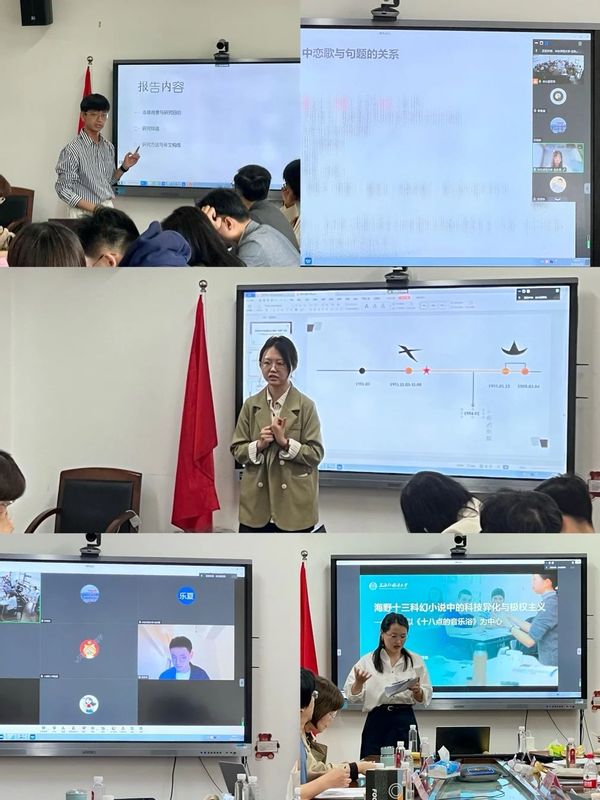 院长杨延宁教授为本次论坛致开场词。他鼓励师生要保持对学术的追求,专注学术研究,以科研服务“国之大者”,为社会进步不断贡献自己的力量。 尤海燕老师在发言中强调了本次论坛,也特别强调了本次沙龙的“四不”(不客套、不吹捧、不浮谈、不敷衍)原则,希望各位老师为同学们的报告提出鞭辟入里的指导意见。 在报告环节,5位博士生分别进行发言。沐海宇报告的题目为“日本江户前期林家交游圈人物的随笔研究”,刘乐夏报告的题目为“中日比较文学视野下的慈圆《文集百首》——以恋歌为中心”,李承坤报告的题目为“‘歧视’的再生产——‘三·一’独立运动时期大众传媒中的‘在日朝鲜人’形象研究”,董悦报告的题目为“近代主义与民族主义之间的‘自我’定位——‘杂种文化论’中的主体性建构与文学关切”,陈瑶报告的题目为“海野十三科幻小说中的科技异化与极权主义——以《十八点的音乐浴》为中心”。 报告结束后,专家们分别开展点评。 撰稿 沐海宇 审核 尤海燕