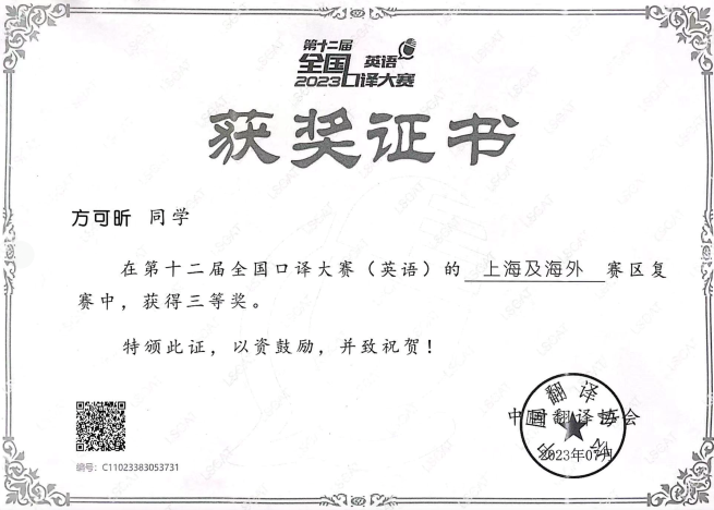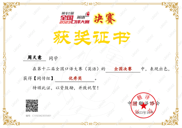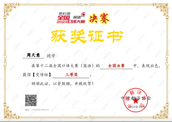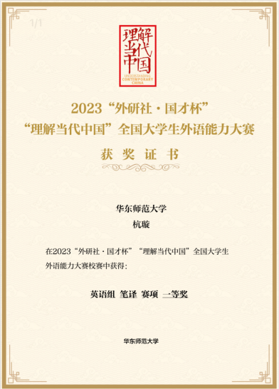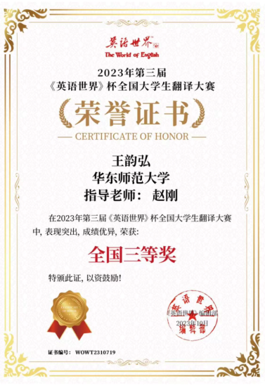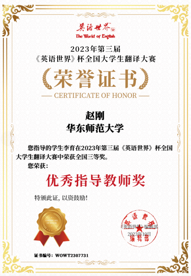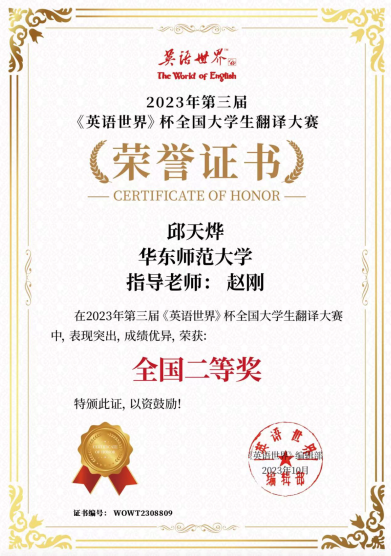 2023年度,在翻译系学子在本系教师的指导下积极参与各类学科竞赛,斩获多项省市级、国家级奖项。其中,赵刚教授指导杭璇同学在外研社国才杯“理解当代中国”全国大学生外语能力大赛获笔译组一等奖;指导邱天烨、王韵弘等几位同学在“英语世界”杯翻译大赛中获三等奖。同时,赵刚教授荣获“优秀指导教师奖”。