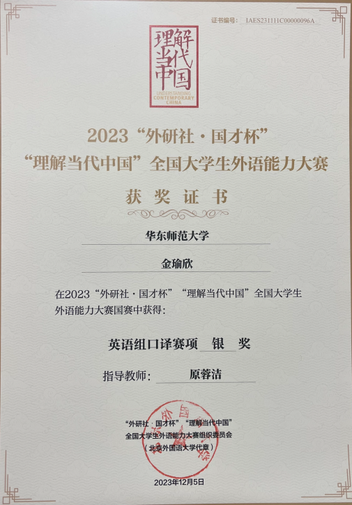 原蓉洁教授指导周天意、方可昕两位同学等参加全国口译大赛,分别获全国总决赛交传组三等奖,同传组优秀奖、上海市复赛三等奖;指导金瑜欣同学在外研社国才杯“理解当代中国”全国大学生外语能力大赛中获口译组银奖。金瑜欣同学同时也获得全国大学生英语竞赛B类二等奖,“21 世纪杯”全国英语演讲比赛上海赛区二等奖。
