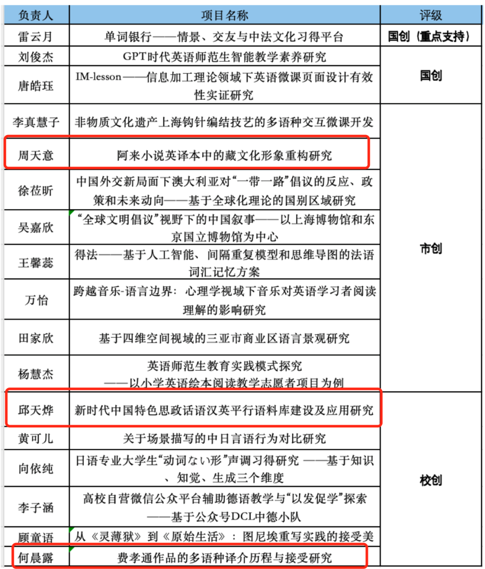 此外,翻译系学生也积极参与本科生创新创业训练培育项目,获得多项科创项目立项。其中周天意同学负责的《阿来小说英译本中的藏文化形象重构研究》获市级立项,邱天烨、何晨露两位同学获得校级立项。
