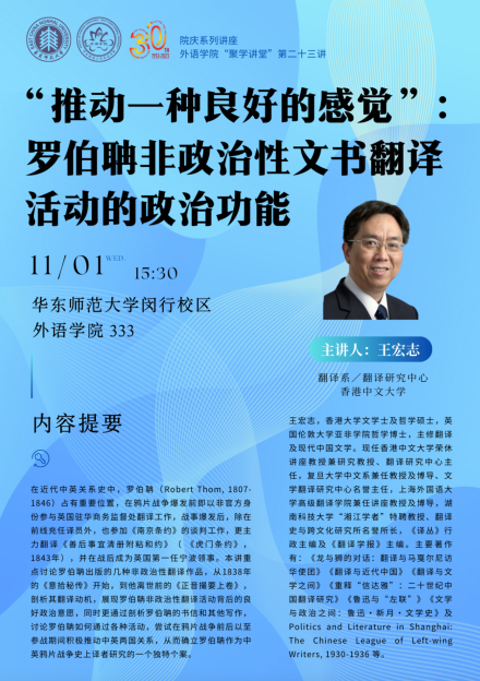 6月24日,陈舒教授主讲毕业一课:《典籍翻译的一个理解问题》。10月20日,赵刚教授主讲校庆学术报告:《中国文学作品英译中的隐化现象研究》。11月1日,香港中文大学翻译系王宏志教授应邀作学术报告:《“推动一种良好的感觉”:罗伯聃非政治性文书翻译活动的政治功能》。