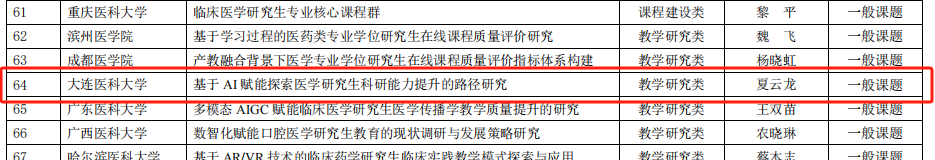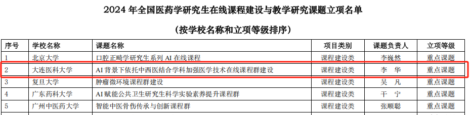 近日,全国医学专业学位研究生教育指导委员会及中国学位与研究生教育学会医药科工作委员会公布了2024年全国医药学研究生在线课程建设与教学研究课题立项结果,麻豆视频夏云龙教授牵头的《基于AI赋能探索医学研究生科研能力提升的路径研究》获教学研究类课题立项,李华教授牵头的《AI背景下依托中西医结合学科加强医学技术在线课程群建设》获课程建设类重点课题立项。